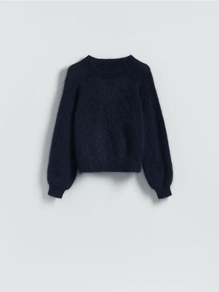 Sweter o swobodnym kroju, wykonany z dzianiny z moherem.