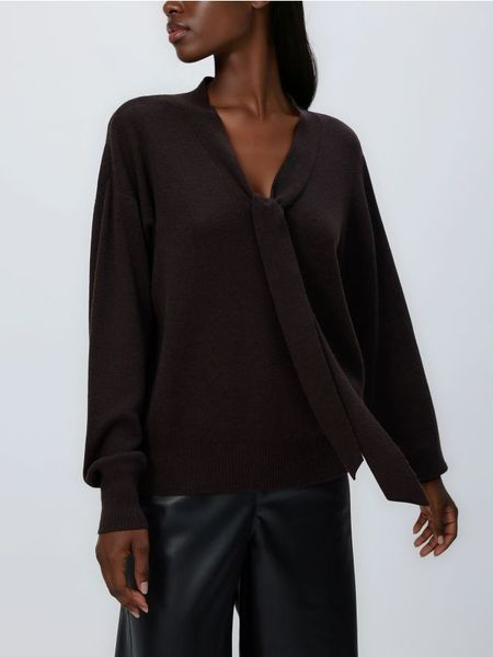 Sweter o prostym kroju, wykonany z dzianiny z domieszką wełny.