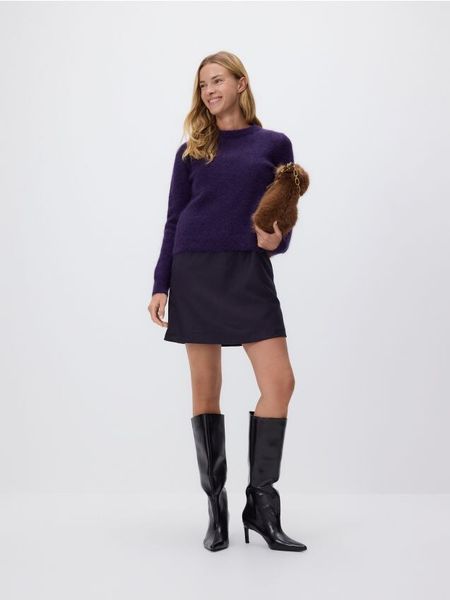 Sweter o prostym kroju, wykonany z dzianiny z dodatkiem wełny i moheru.