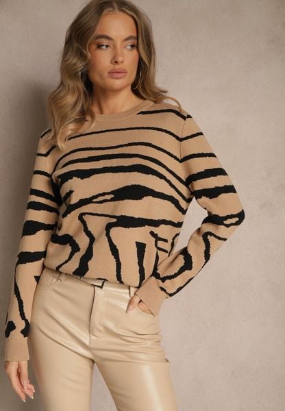 Ciemnobeżowy Klasyczny Sweter w Zebrę Unarella