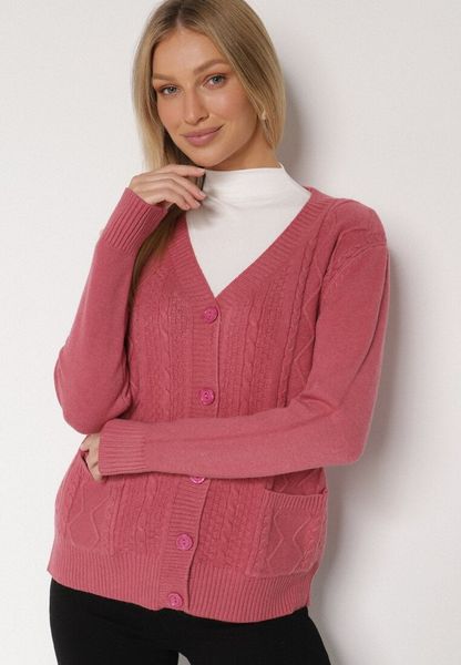 Ciemnoróżowy Kardigan z Bawełną Zdobiony Warkoczowym Splotem i Kieszeniami Mevesava