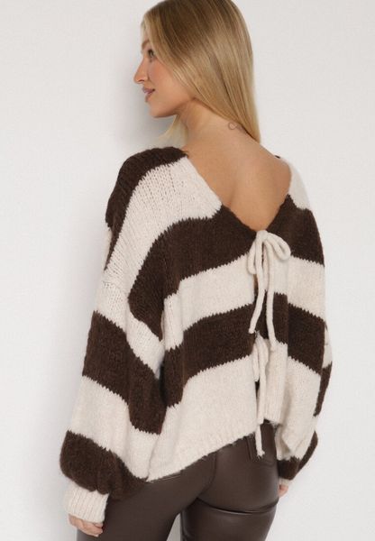 Brązowy Wiązany Kardigan Oversize w Paski z Dodatkiem Wełny i Wiskozy Retire