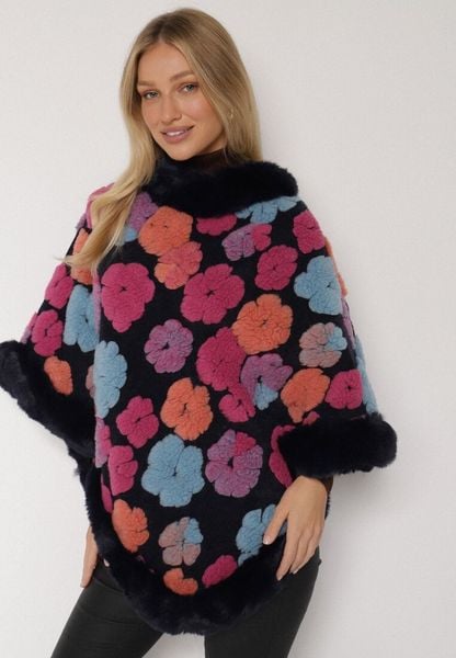 Granatowe Ponczo z Wiskozy Zdobione Futrzanymi Aplikacjami w Kształcie Kwiatów Lealithwen