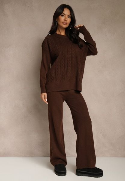 Brązowy Dzianinowy Komplet z Wełną w Warkoczowy Splot Spodnie i Sweter Reinette
