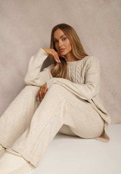 Beżowy Dzianinowy Komplet z Wełną w Warkoczowy Splot Spodnie i Sweter Reinette