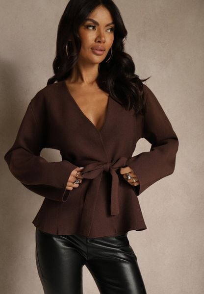 Brązowy Kardigan z Wiskozą Ozdobiony w Pasie Wiązaniem Tusllima