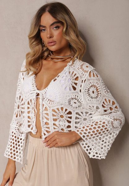 Biały Bawełniany Wiązany Kardigan Narzutka z Ażurowym Motywem Lunalea