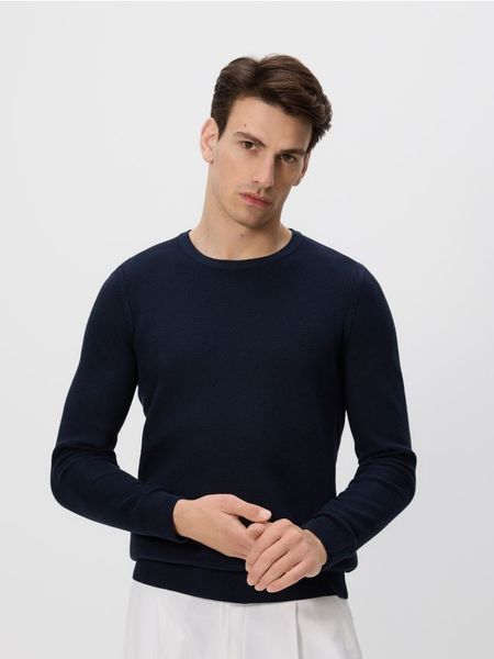 Sweter o prostym kroju, wykonany z bawełnianej dzianiny.