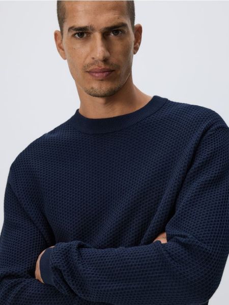 Sweter o prostym fasonie, wykonany ze strukturalnej, bawełnianej dzianiny.