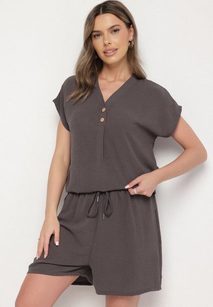 Ciemnoszary Komplet z Wiskozą Bluzka Zdobiona Guzikami i Szorty Nitamea