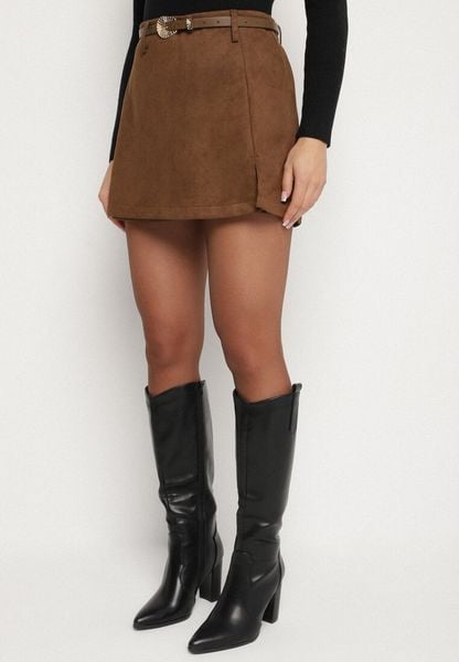 Brązowe Spódnico-Szorty z Wysokim Stanem Ozdobione Paskiem z Metaliczną Klamrą Henilia