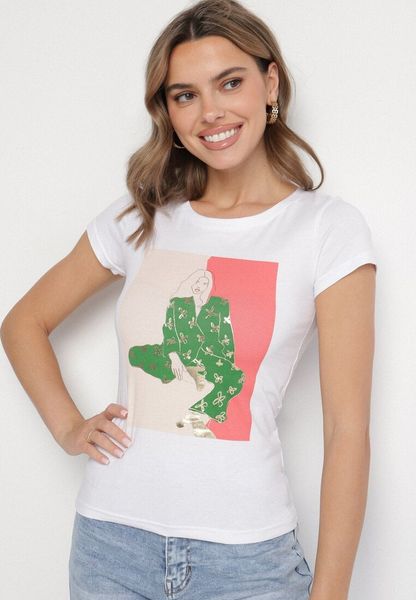 Biały Bawełniany T-shirt z Ozdobnym Nadrukiem Setonisea