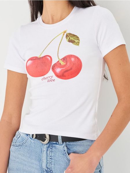 Sinsay – Koszulka z nadrukiem – biały – ozdobny nadruk,krótki rękaw,okrągły dekolt