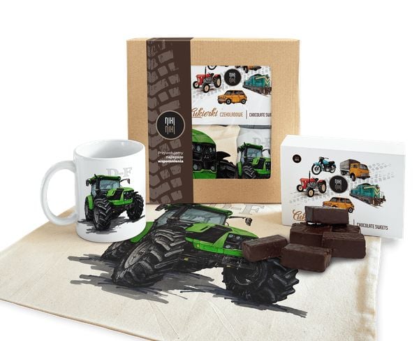 Paczka prezentowa z traktorem Deutz-Fahr cukierki czekoladowe 125 gkubek ceramicznytorba bawełniana Paczkę można dodatkowo powiększyć o koszulkę lub bluzę (Kliknij aby zobaczyć wymiary i specyfikacje)Ciągnik Deutz-Fahr 5110Autorem rysunku jest Mariusz Felek Foltak.