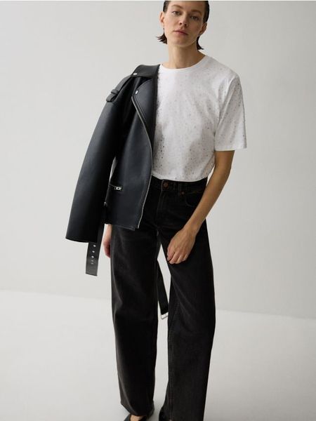 T-shirt o prostym kroju, wykonany z bawełnianej dzianiny.