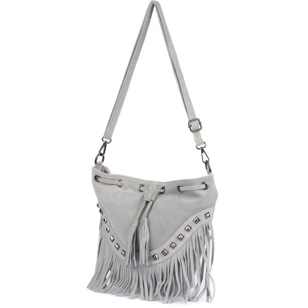 Damska, skórzana zamszowa torebka worek, listonoszka na ramię z usztywnianym dnem!Torebka jest solidnej włoskiej produkcji.Posiada widoczne na zdjęciach ćwieki i frędzle. Jest bardzo wygodna w użytkowaniu, nie za duża, ale dzięki swojemu fasonowi bardzo pojemna!Wymiary: 24x30x15 cm