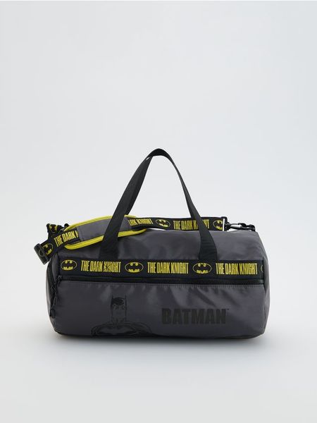 Duża torba w sportowym stylu, wykonana z gładkiej tkaniny.