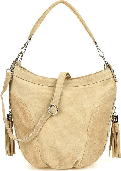Vera Pelle Beżowa Torebka damska skórzana worek frędzel A5 modna L81