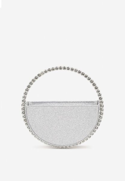 Srebrna Okrągła Torebka Koktajlowa Ozdobiona Cyrkoniami i Brokatem Fesimala