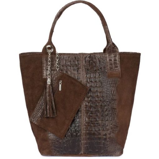 Brązowa Torebka Shopper z Ekozamszu Zdobiona Eleganckim Łańcuszkiem Leathraen