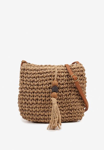 Ciemnobeżowa Pleciona Torebka z Frędzlami Tirauri