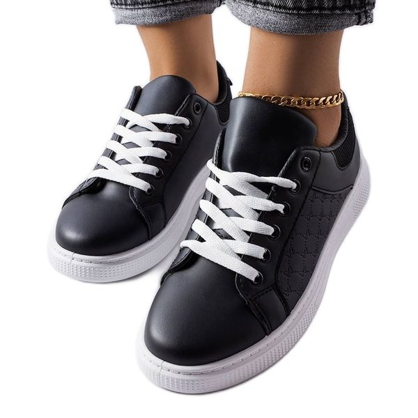 Czarne Tenisówki Zdobione Tłoczonym Wzorem z Ozdobnymi Sznurówkami Paloniela