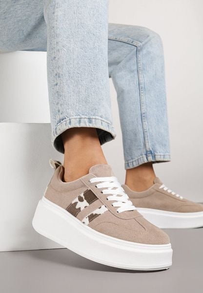 Ciemnobeżowe Sneakersy Klasyczne Tenisówki na Grubej Podeszwie z Koturnem i Paskami Ozdobionymi Printem w Łaty Adessia