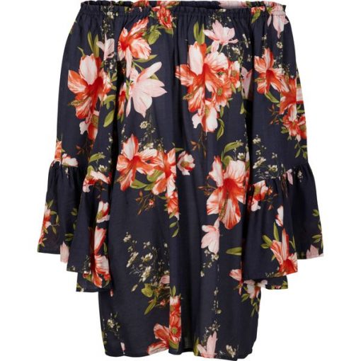 „Stylowa tunika plażowa z modnym dekoltem carmen. Tunika z dekoltem „”carmen”” i szerokimi rękawami z falbanami.”