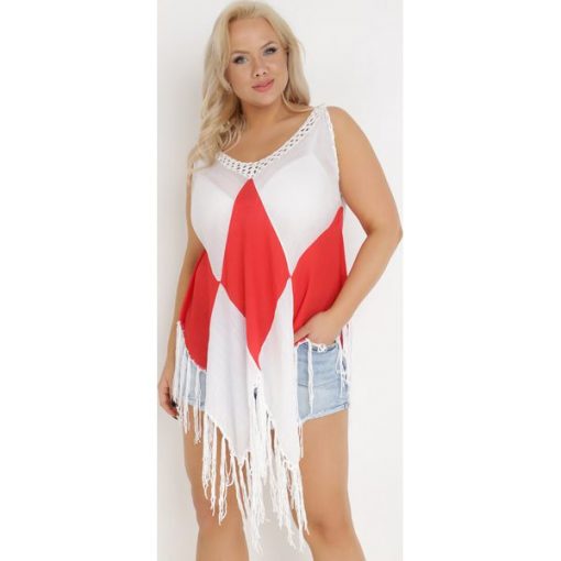 Tunika Nyssaia o fasonie narzutki, bez rękawów, z trójkątnym dekoltem ozdobionym ażurową, szeroką taśmą przy krawędzi. Z asymetrycznym dołem i frędzlami. Z kolorowymi wstawkami w kształcie rombów. Zakładana przez głowę. Sprawdzi się doskonale do noszenia na plaży!