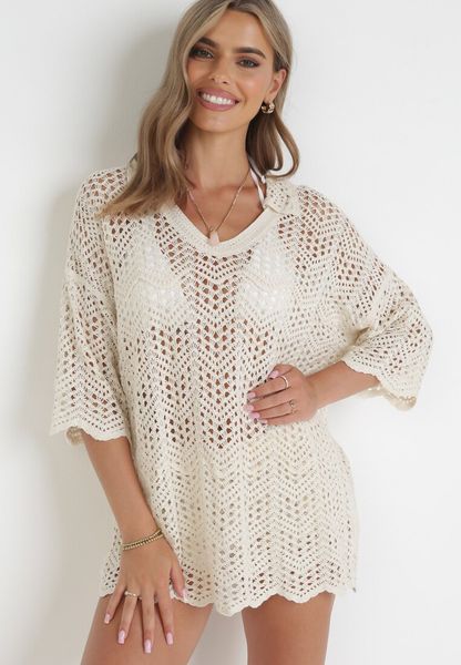 Szydełkowa Tunika Leanis wykonana z bawełnianej tkaniny. Krój oversize, z rękawem o długości 3/4. Idealna na co dzień lub na plażę – noś ją tak jak lubisz!