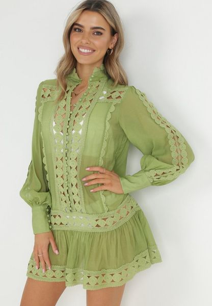 Zielona Pudełkowa Tunika z Koronką i Długim Rękawem Ahrar
