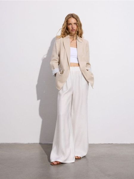 Marynarka o swobodnym fasonie, uszyta z tkaniny na bazie lnu i wiskozy.
