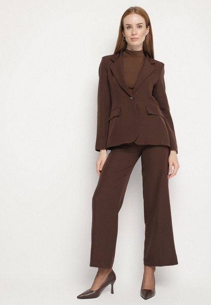 Brązowy Komplet Garniturowy z Wiskozą Marynarka na Guzik i Szerokie Spodnie Tevora