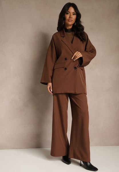 Brązowy Komplet Garniturowy Dwurzędowa Marynarka Oversize i Szerokie Spodnie Tevalda